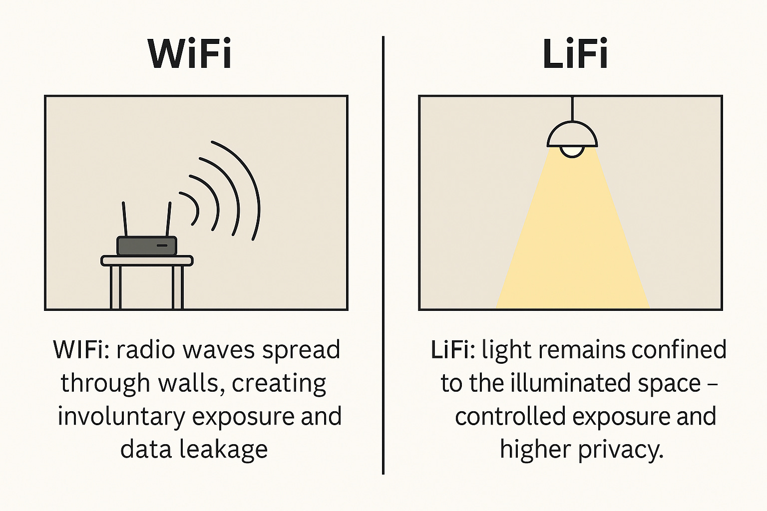 While scientific debate continues, precaution is a core principle of building biology: if there is reasonable concern, exposure should be reduced where possible. This is where LiFi – Light Fidelity – enters the discussion. LiFi uses light instead of radio waves for wireless data transmission and is often presented as a safer, more natural alternative.